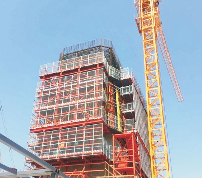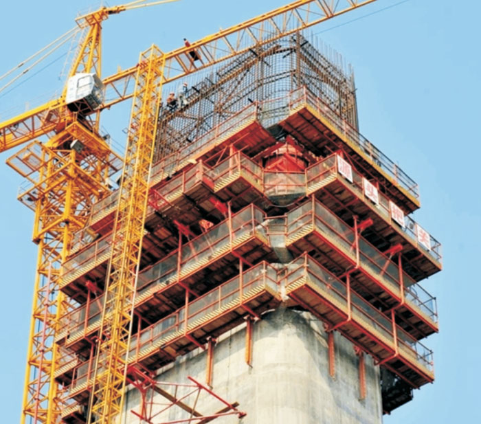 爬模是爬升模板的簡(jiǎn)稱,國(guó)外也叫跳模。它由爬升模板、爬架(也有的爬模沒(méi)有爬架)和爬升設(shè)備三部分組成,在施工剪力墻體系、筒體體系和橋墩筀等高聳結(jié)構(gòu)中是一種有效的工具。由于具備自爬的能力,因此不需起重機(jī)械的吊運(yùn),這減少了施工中運(yùn)輸機(jī)械的吊運(yùn)工作量。在自爬的模板上懸掛腳手架可省去施工過(guò)程中的外腳手架。綜上,爬升模板能減少起重機(jī)械數(shù)量、加快施工速度,因此經(jīng)濟(jì)效益較好。